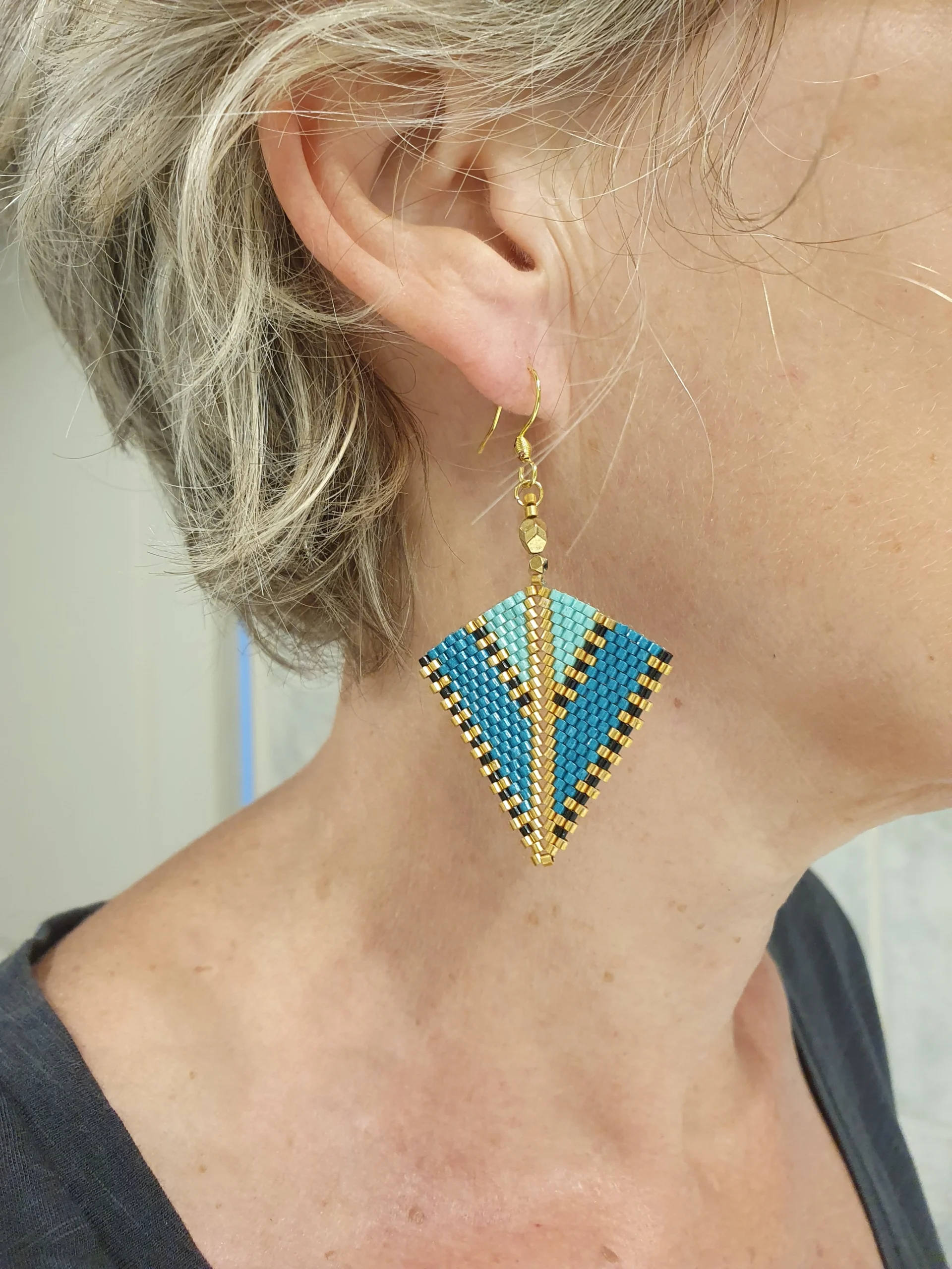 Le motif est entièrement réalisé à la main selon la technique du tissage peyote en diagonal, qui permet un rendu souple mais structuré. Les perles de verre Miyuki, dans des tons de bleu turquoise, bleu profond, doré et noir, s’harmonisent pour créer un contraste lumineux et élégant.