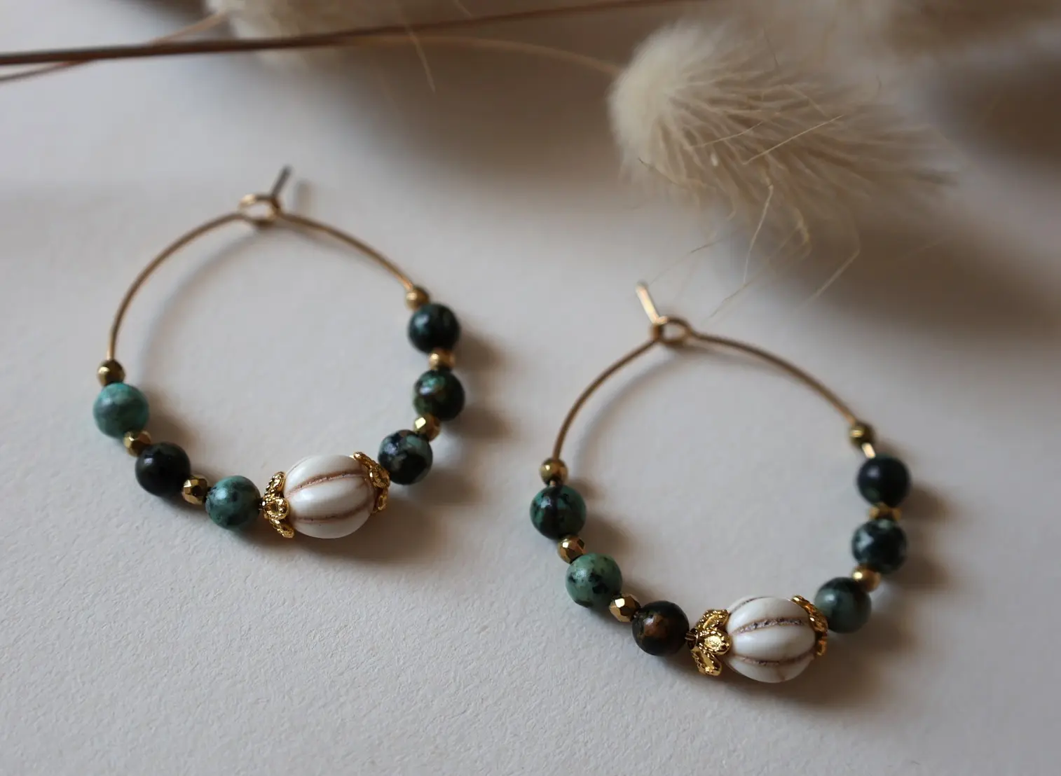 Les boucles d’oreilles Créoles Orell sont formées d’une perle en magnésite en forme de melon cannelé, associée à 6 perles en turquoise africaine, évoquant une petite fleur en bouton comme une clochette de muguet.