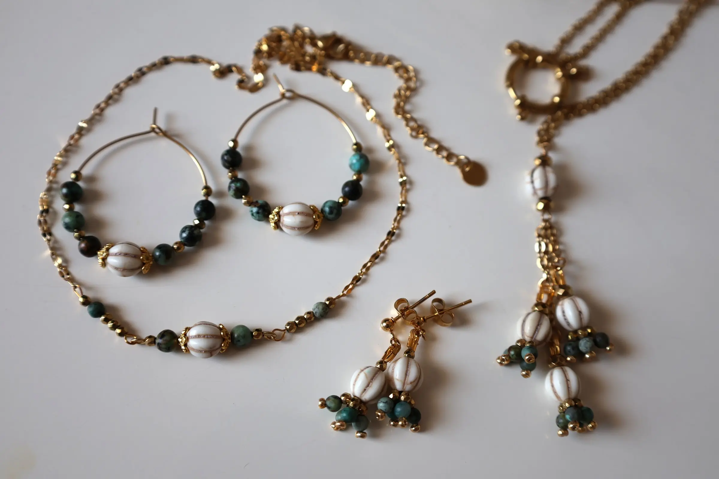 La collection Orell s’articule autour de 2 gemmes principales – la magnésite couleur crème et la turquoise africaine (variété de jaspe mélange de vert, bleu-vert, et de veines noires ou marron) – mises en valeur par des petites perles facettées en hématite dorée.
