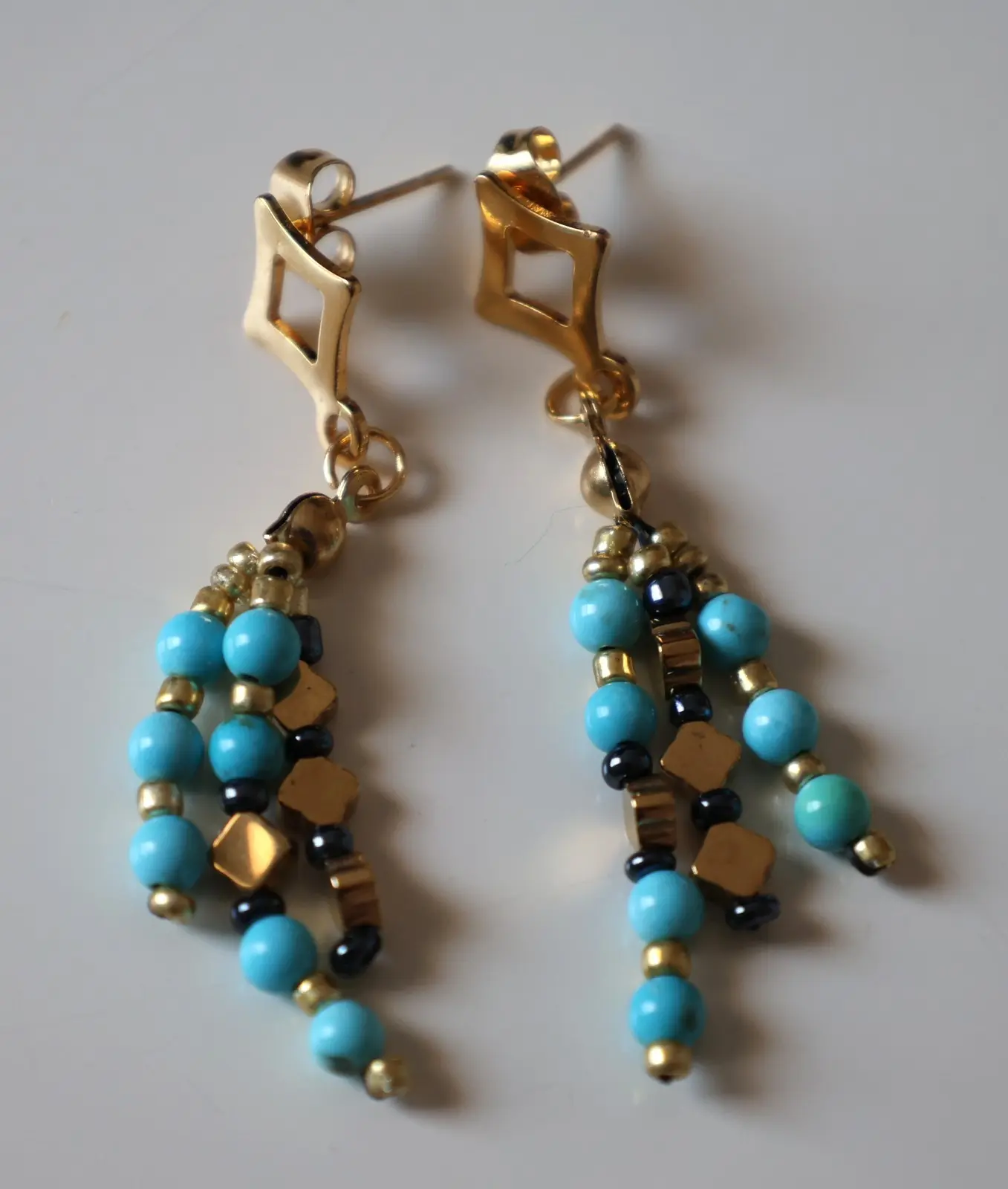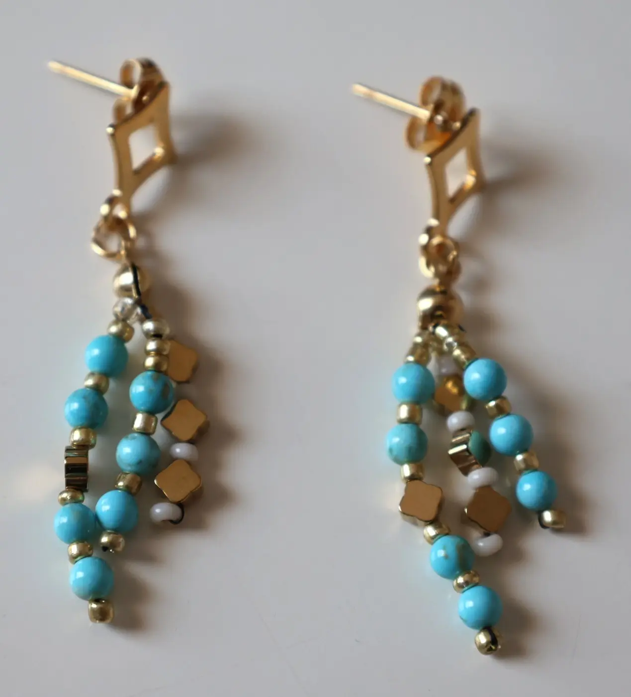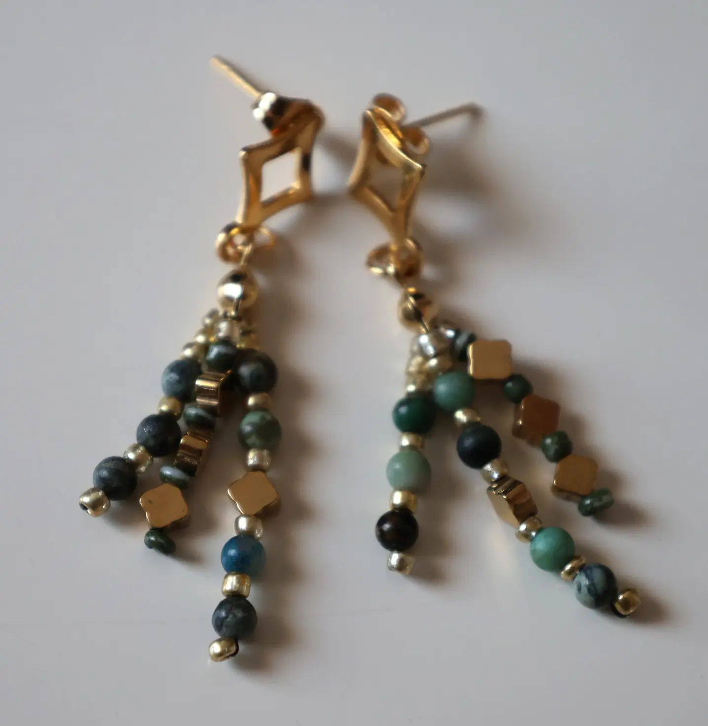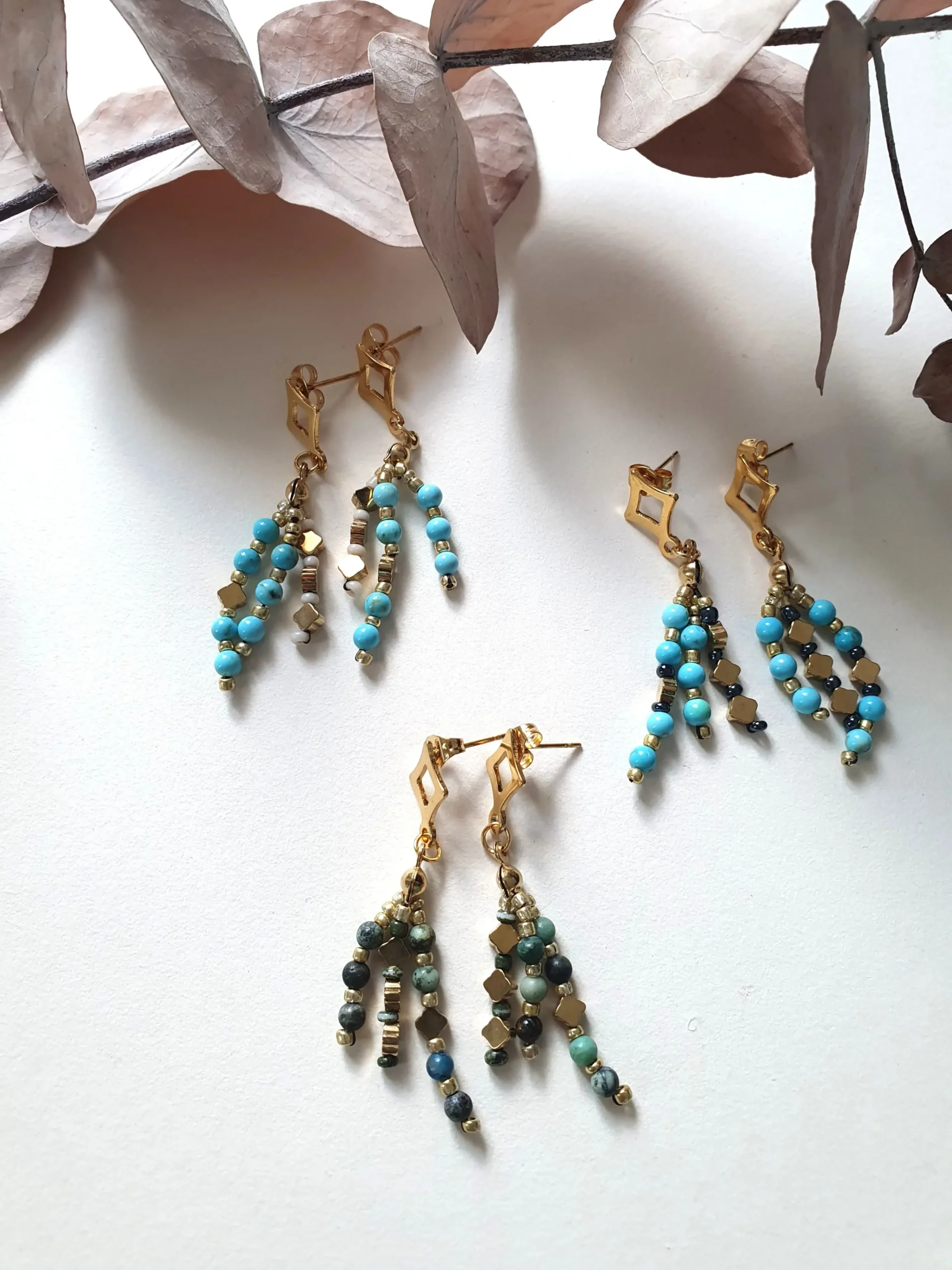 Ces boucles d’oreilles dorées se composent de trois brins mobiles ornés de perles de pierre naturelle, de petites perles de rocaille et d’éléments géométriques. Légères et pleines de mouvement, elles apportent une touche bohème chic à votre tenue, tout en finesse.