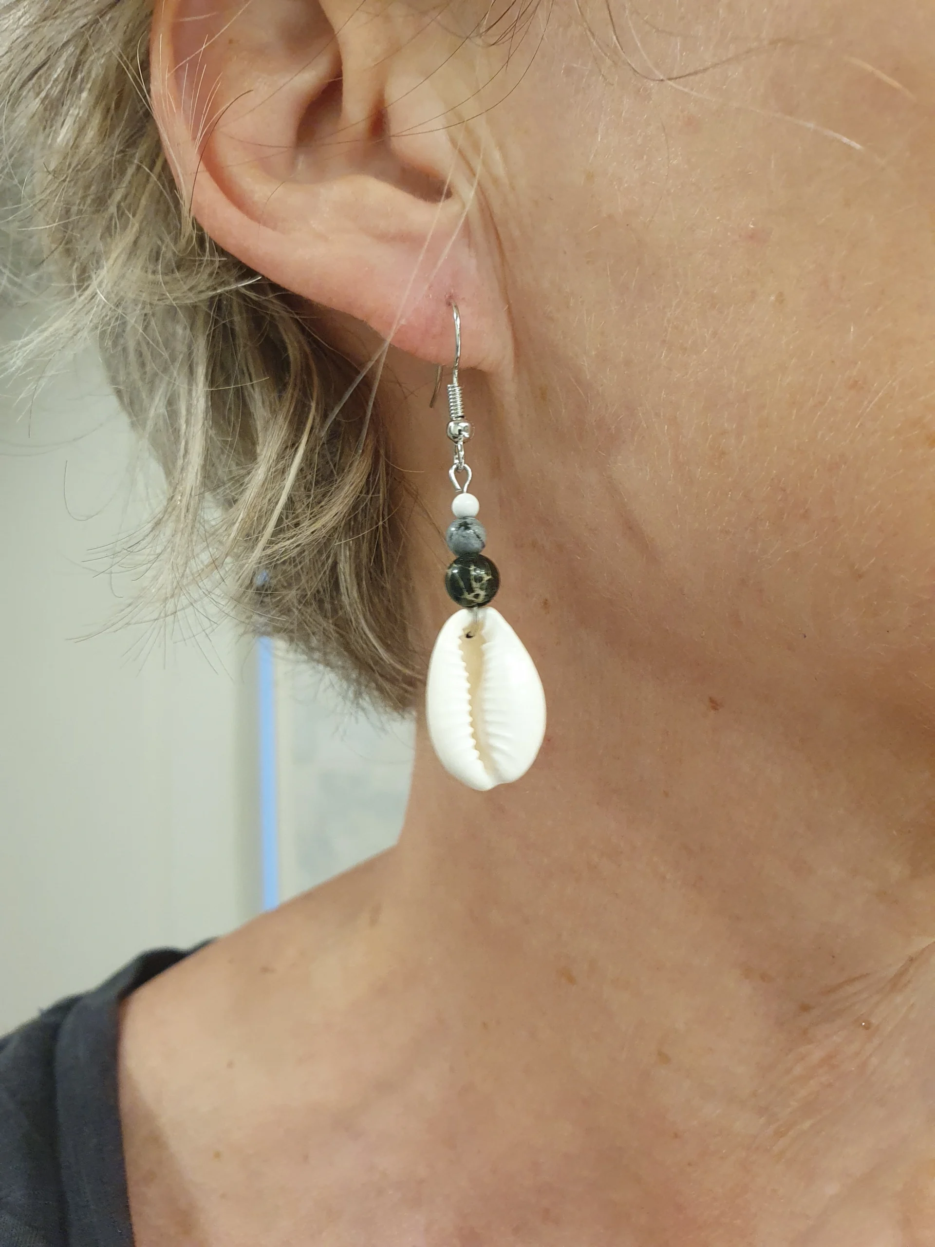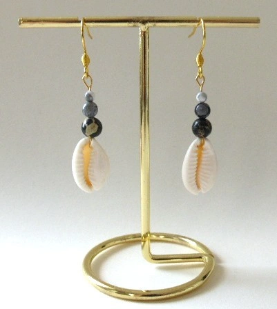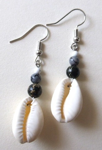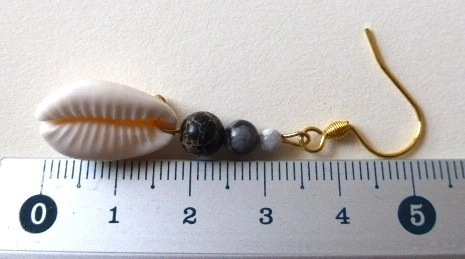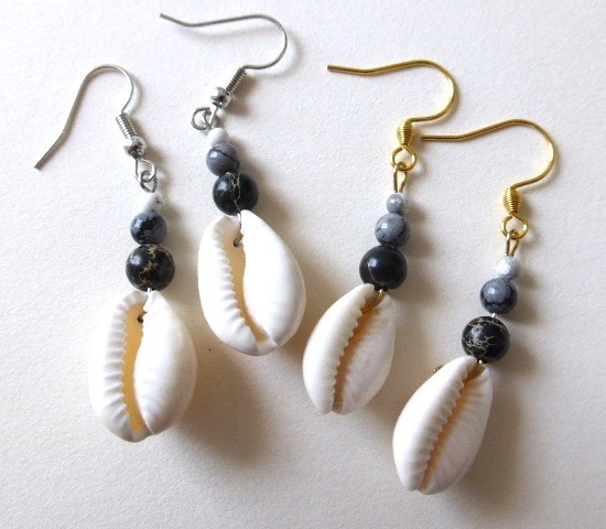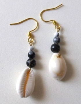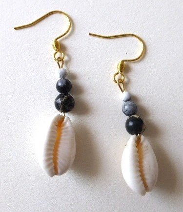 - Nom :Boucles d’oreilles Kaura – Cauris et jaspe gris