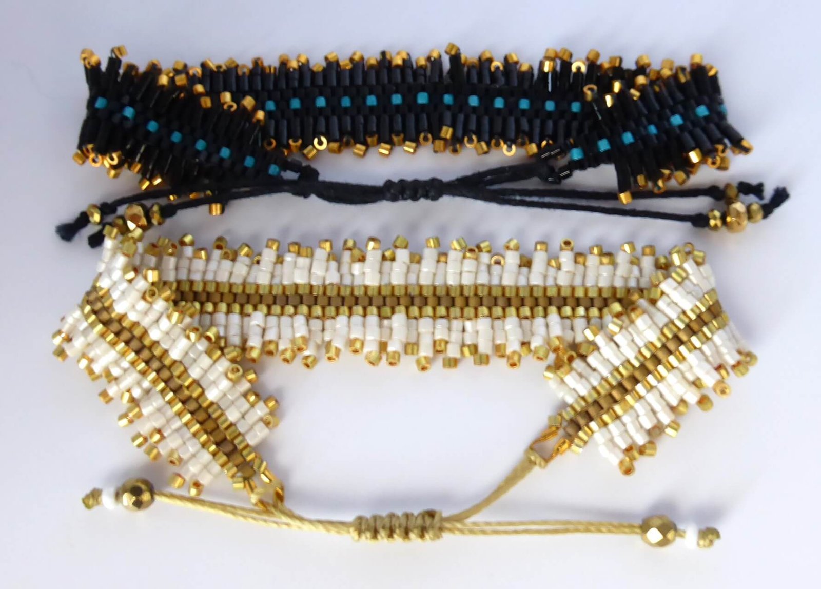 Bracelet Gypset de style bohème chic en forme de ruban de perles entièrement tissées à la main. Taille ajustable par lien coulissant.