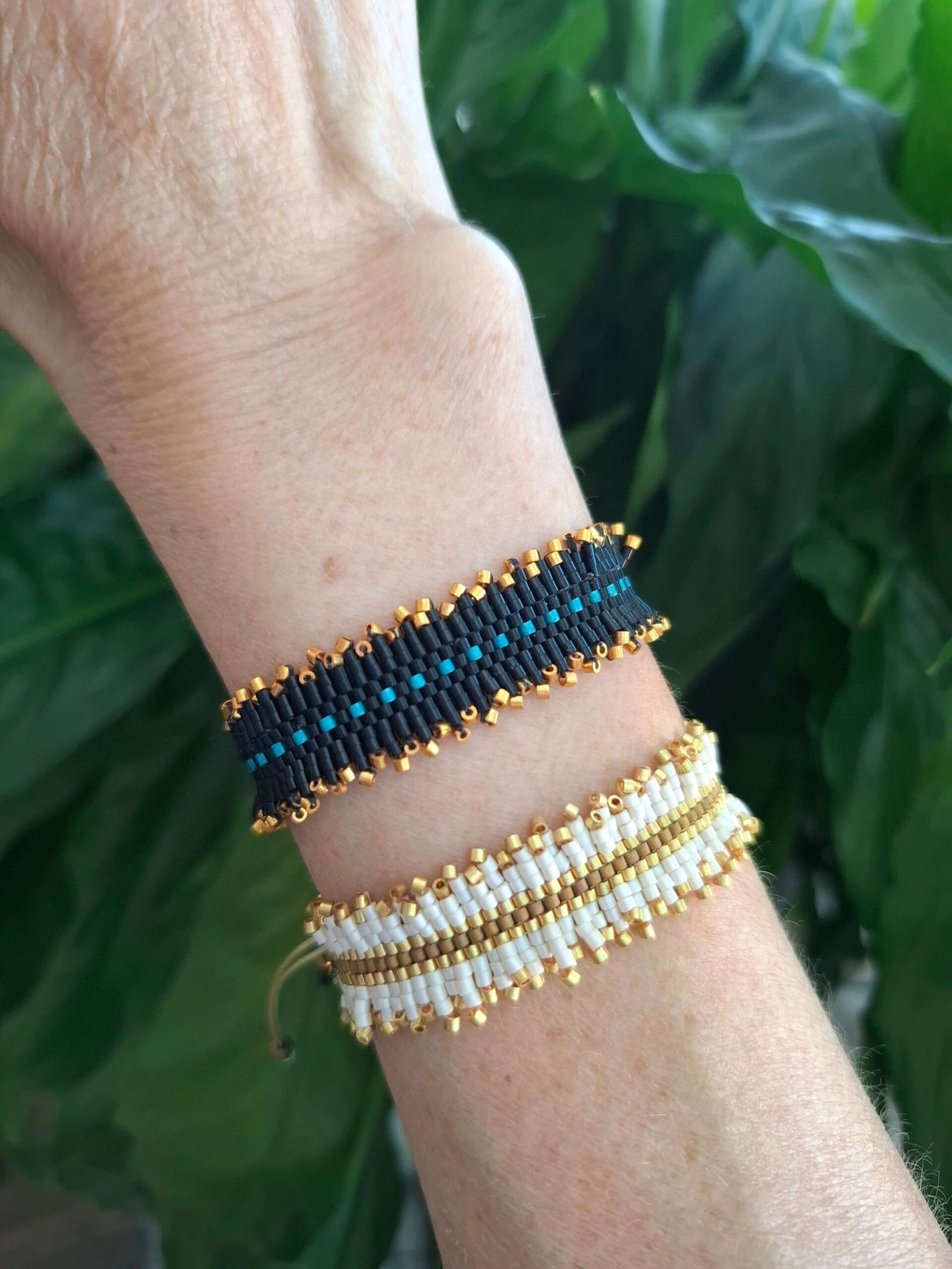 Laissez vous séduire par ce bracelet au style bohème chic formé d’un ruban de perles miyuki entièrement tissées à la main.