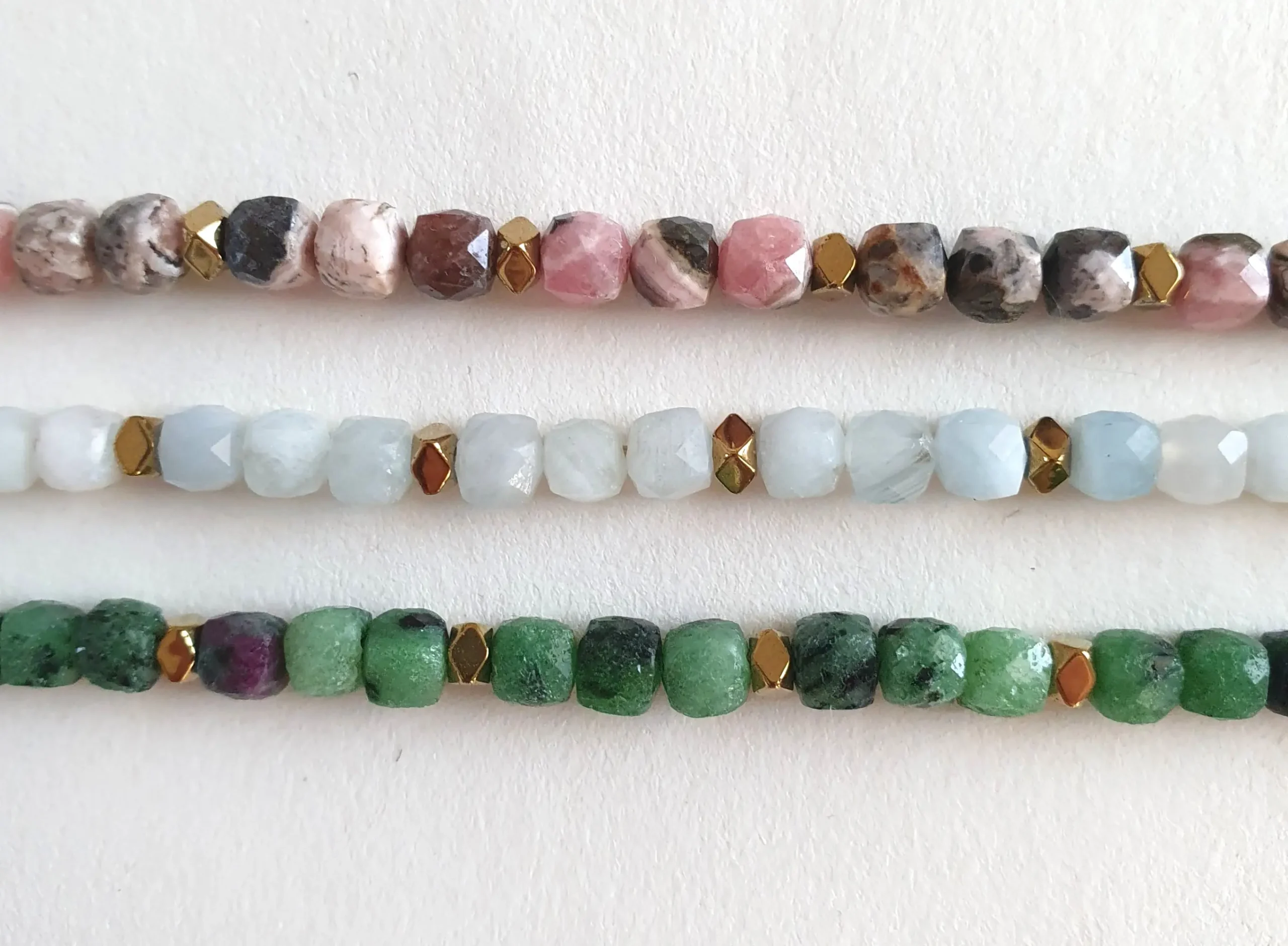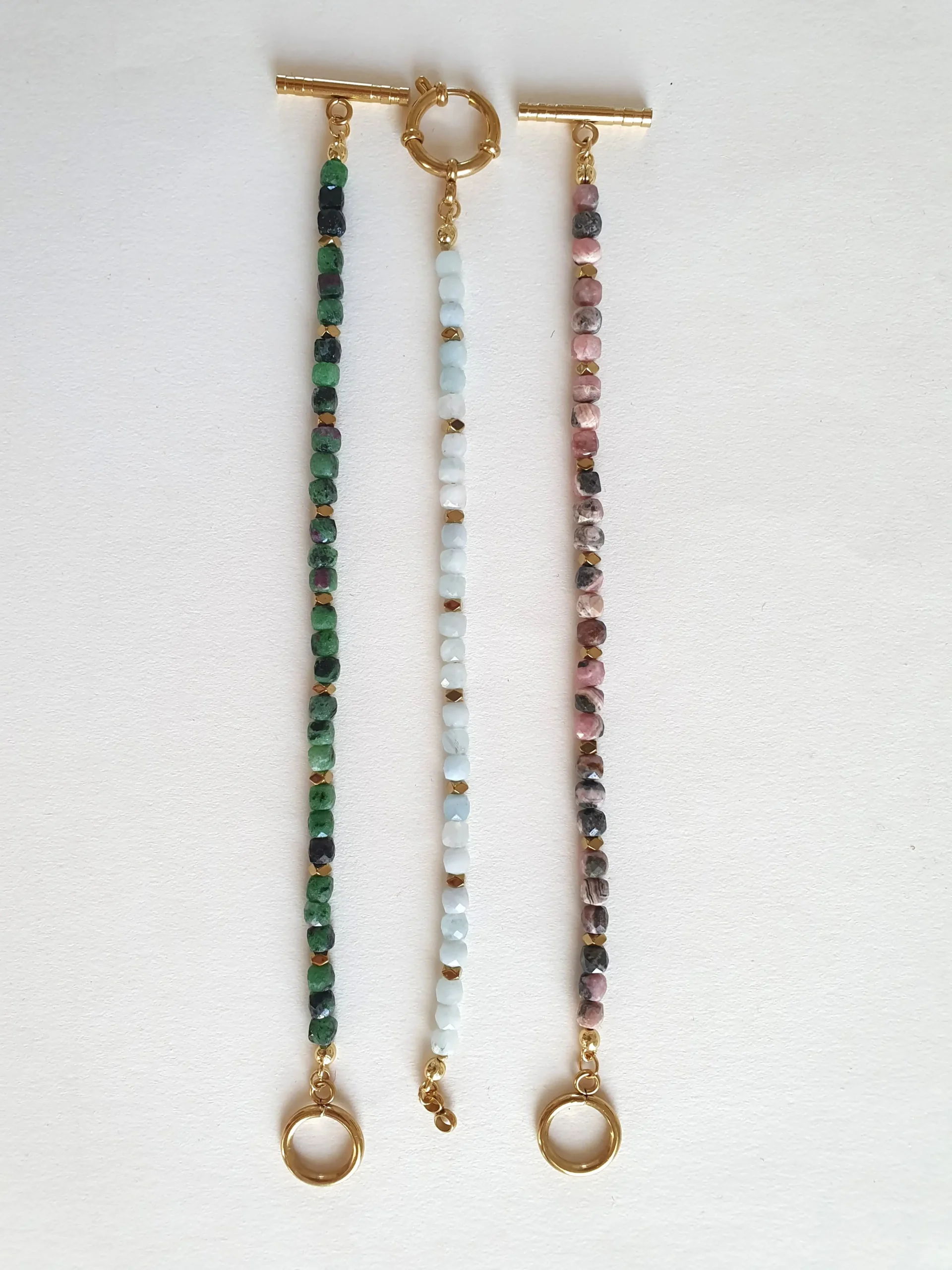 Le bracelet single rang Eos est porteur d’équilibre et de naturel. Composé de perles en pierre gemme naturelle, il se décline en trois modèles: une version verte avec des perles en épidote (pierre de régénération et d’ancrage), une version rose avec des perles en rhodochrosite (pierre du cœur et de la tendresse) et une version blanche avec des perles en aigue-marine, douce et lumineuse. Chaque perle facettée capte la lumière et révèle toute la beauté de ces pierres naturelles, sublimées par des finitions dorées. Un bracelet unique qui mêle élégance, énergie et féminité.