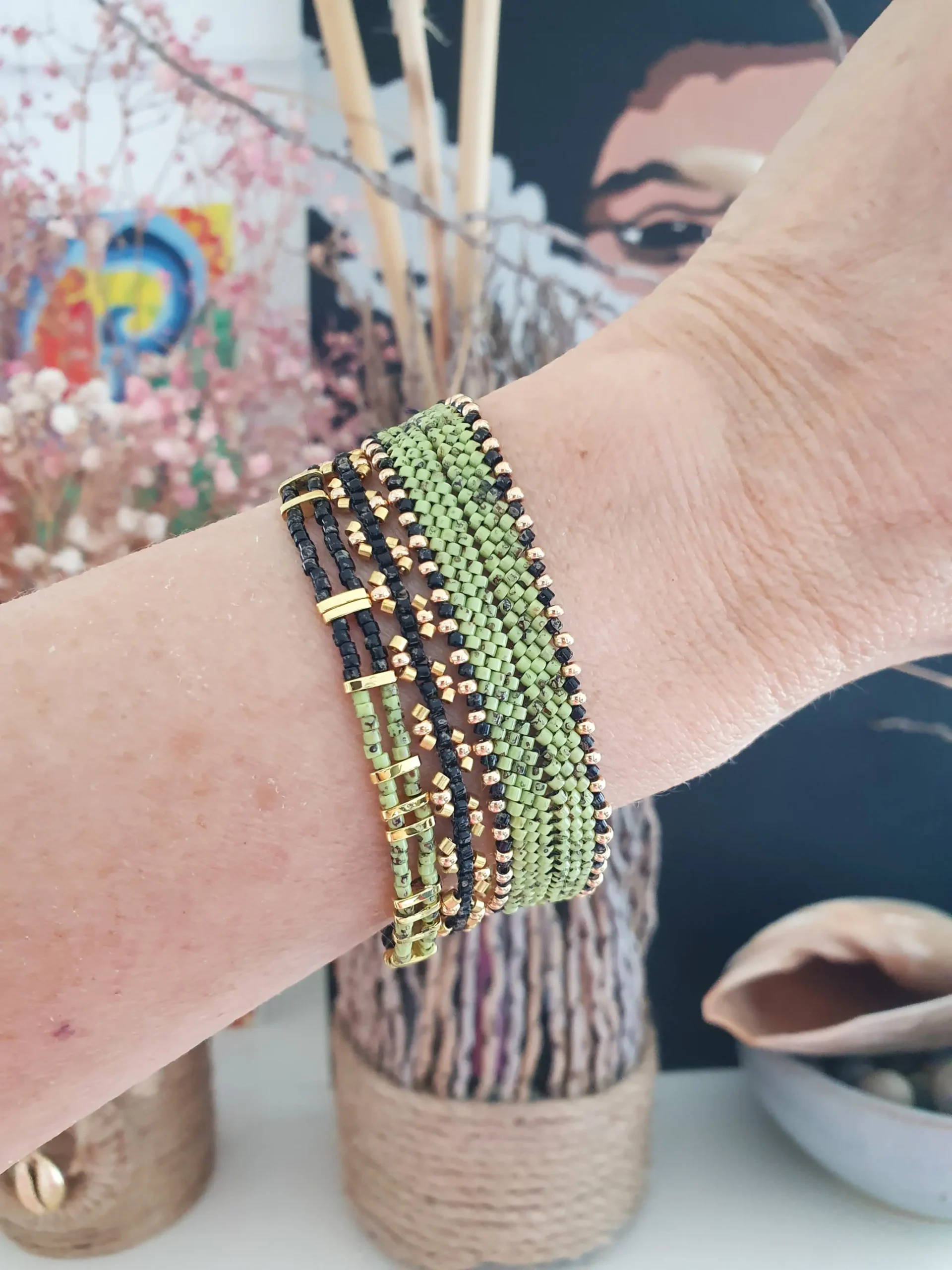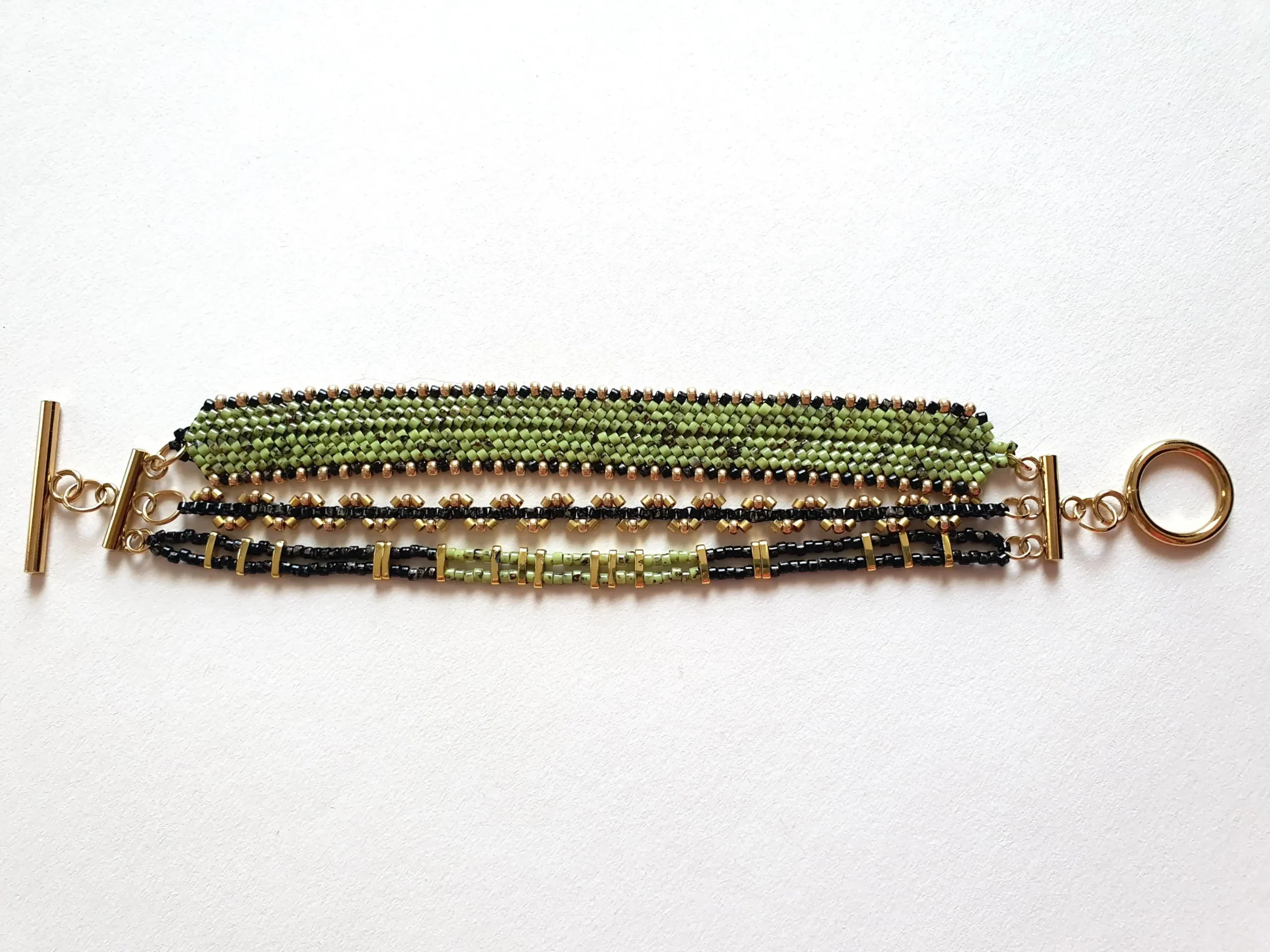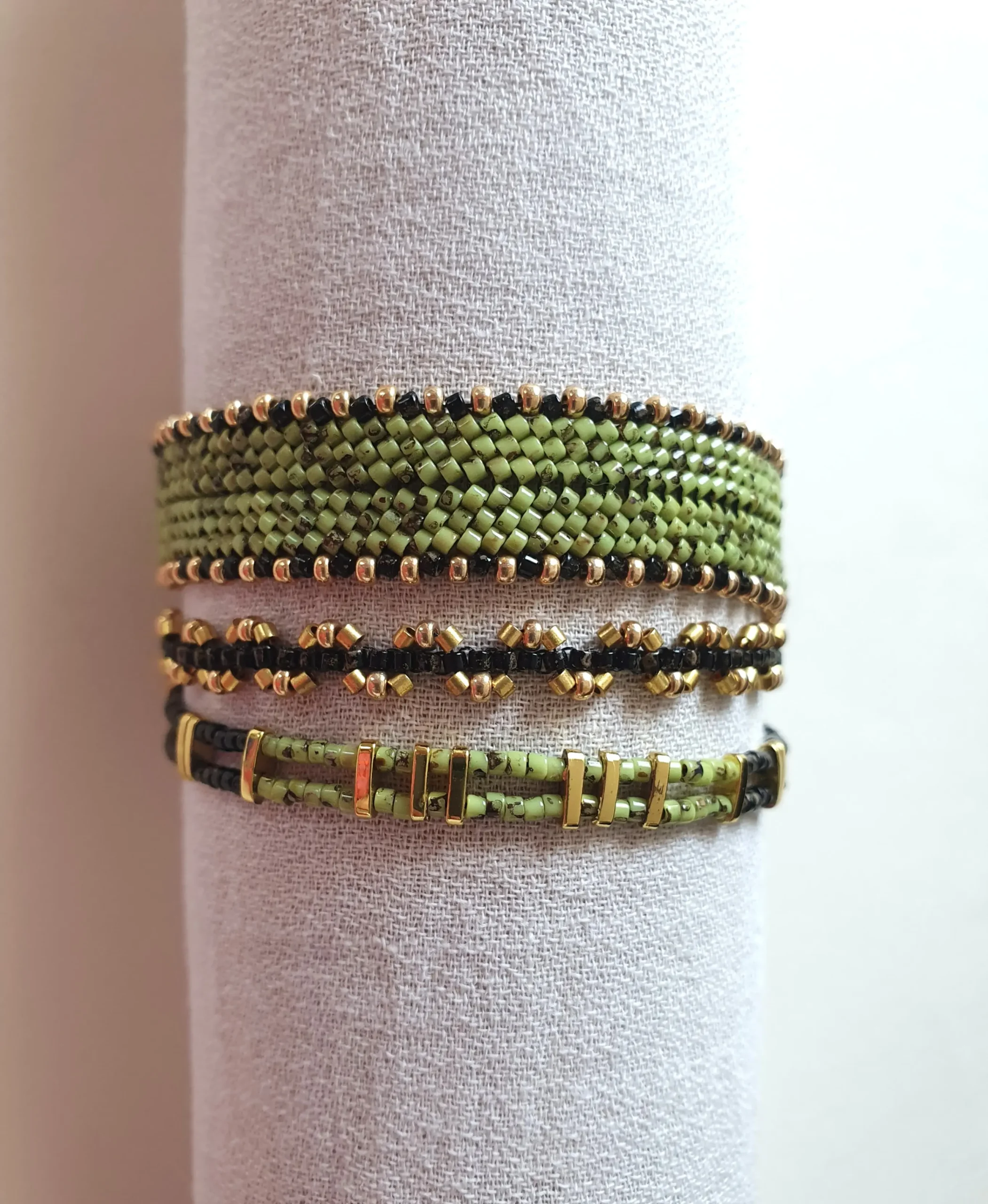 Lumineux et audacieux, le bracelet Anisé marie avec finesse l’art du tissage à la main et l’éclat des perles dorées. Composé de trois rangs distincts, il associe un ruban tissé en peyote diagonal vert anis picasso bordé de noir et d’or, un rang plus fin noir picasso et doré, et un dernier en perles assemblées en double fil dans les mêmes tonalités. Le tout crée un jeu de textures harmonieux et graphique. Ce bijou vibrant évoque la fraîcheur végétale et l’élégance artisanale, pour un style affirmé et lumineux.