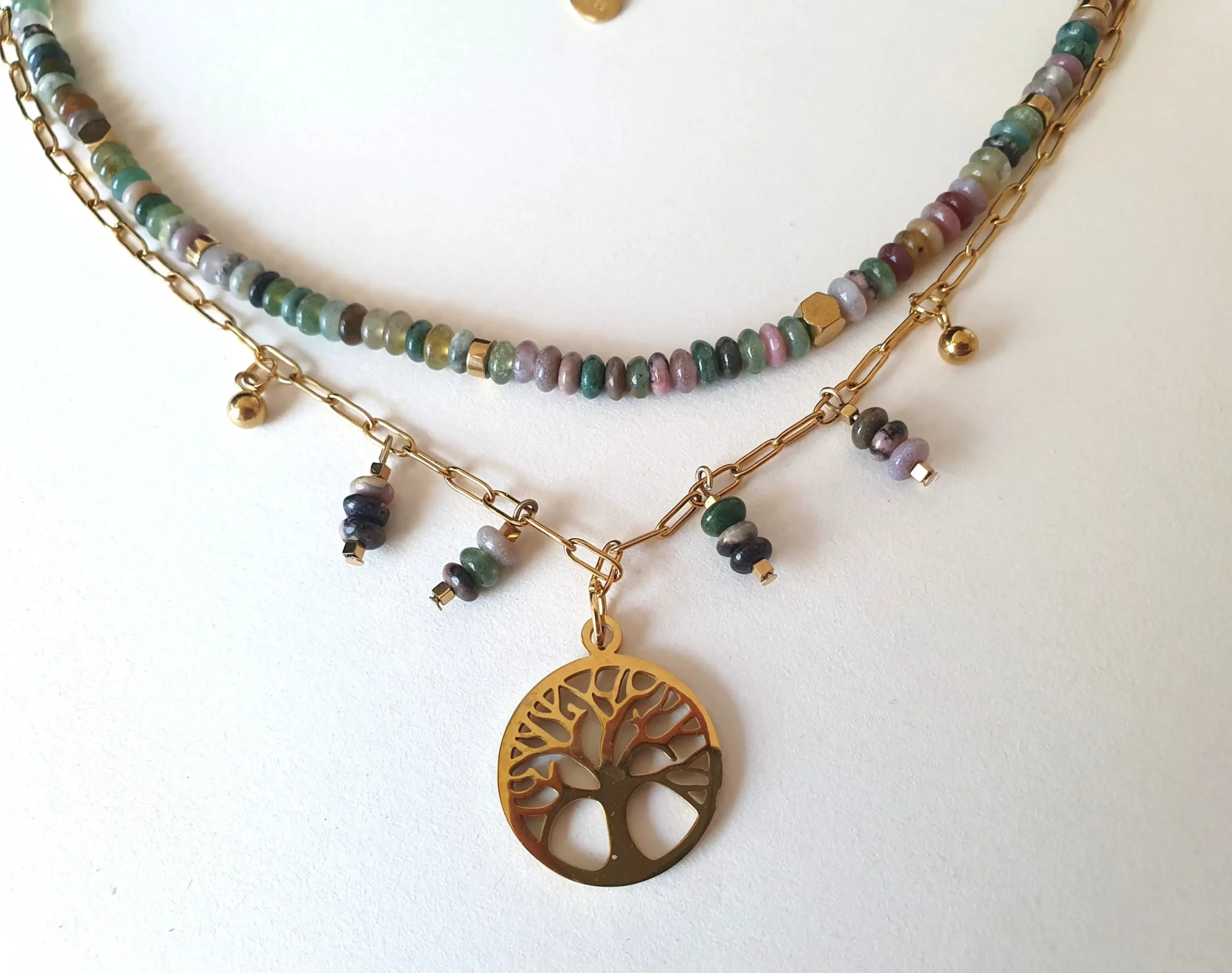 Ce collier de la collection Vitae associe un rang de perles fines – en jade dans les tons gris et vert, rhodochrosite et hématite dorée – à une chaine en acier inoxydable doré rehaussés de six petites breloques et d’un pendentif symbole universel : l’arbre de vie. Ce bijou évoque la croissance, l’enracinement et l’harmonie entre corps, cœur et esprit.