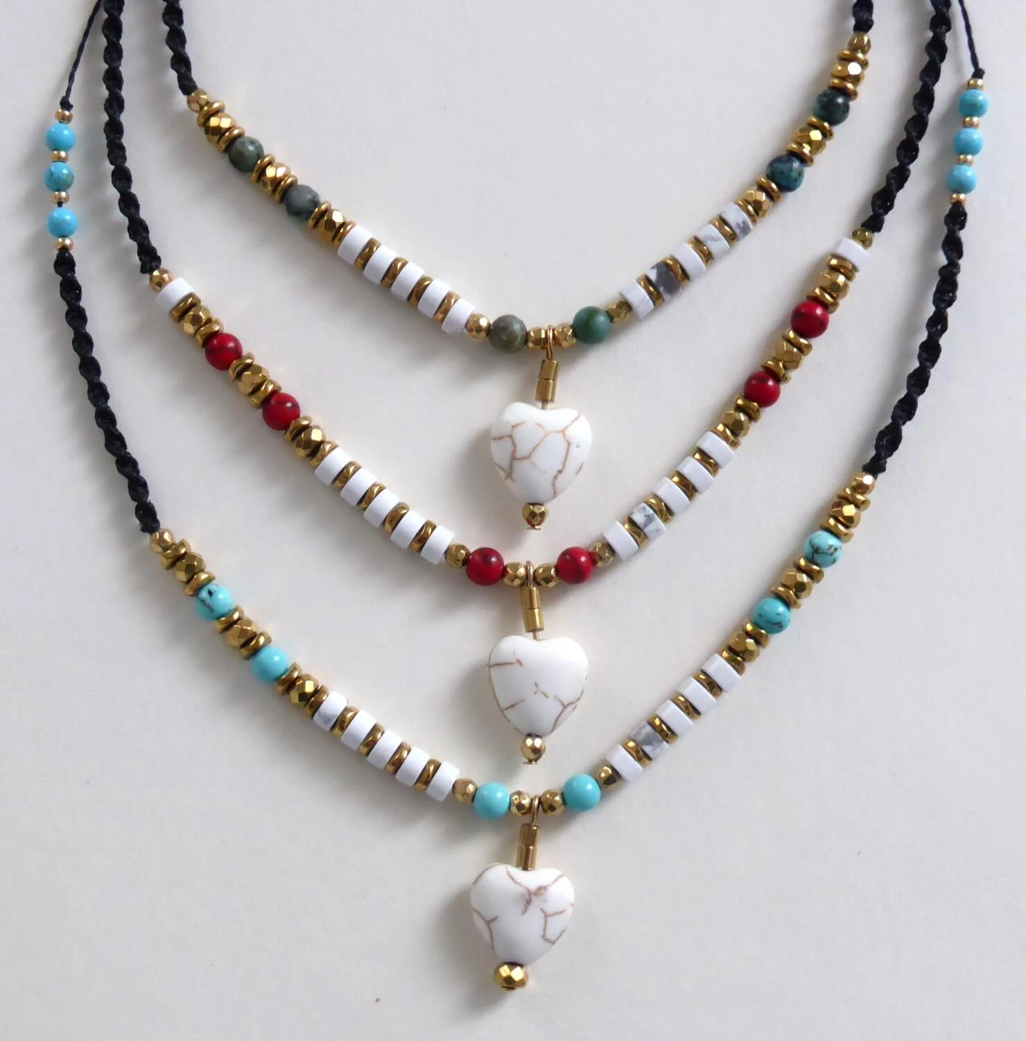 Collier en pierre naturelle (turquoise africaine, turquoise et howlite) avec pendentif cœur en howlite blanc. Longueur ajustable.